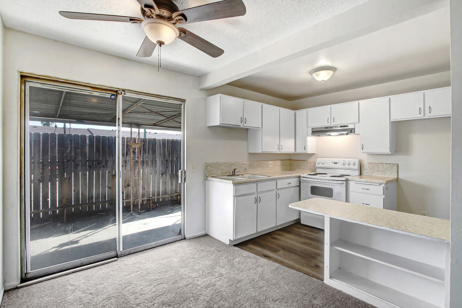 Enjoy a spacious layout featuring a cozy carpeted living room and stylish laminate wood flooring throughout. The kitchen comes equipped with a stove and garbage disposal, making everyday living easy and efficient. Stay comfortable year-round with central AC and heating, along with ceiling fans for added comfort.