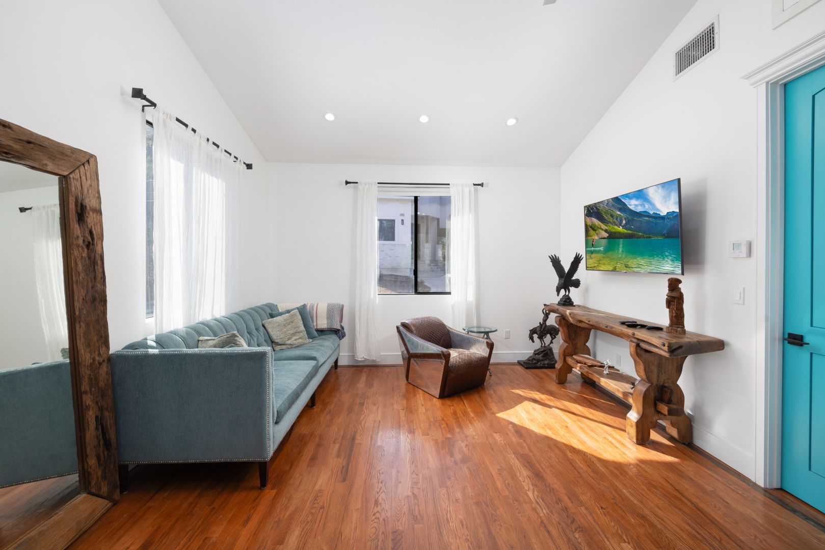 The spacious living room features recessed lighting and elegant laminate wood flooring, creating a warm and inviting atmosphere. The modern kitchen is fully equipped with a refrigerator, microwave, dishwasher, stove, and garbage disposal, making meal preparation effortless. Additional conveniences include an in-home laundry room, air conditioning, and ceiling fans throughout.