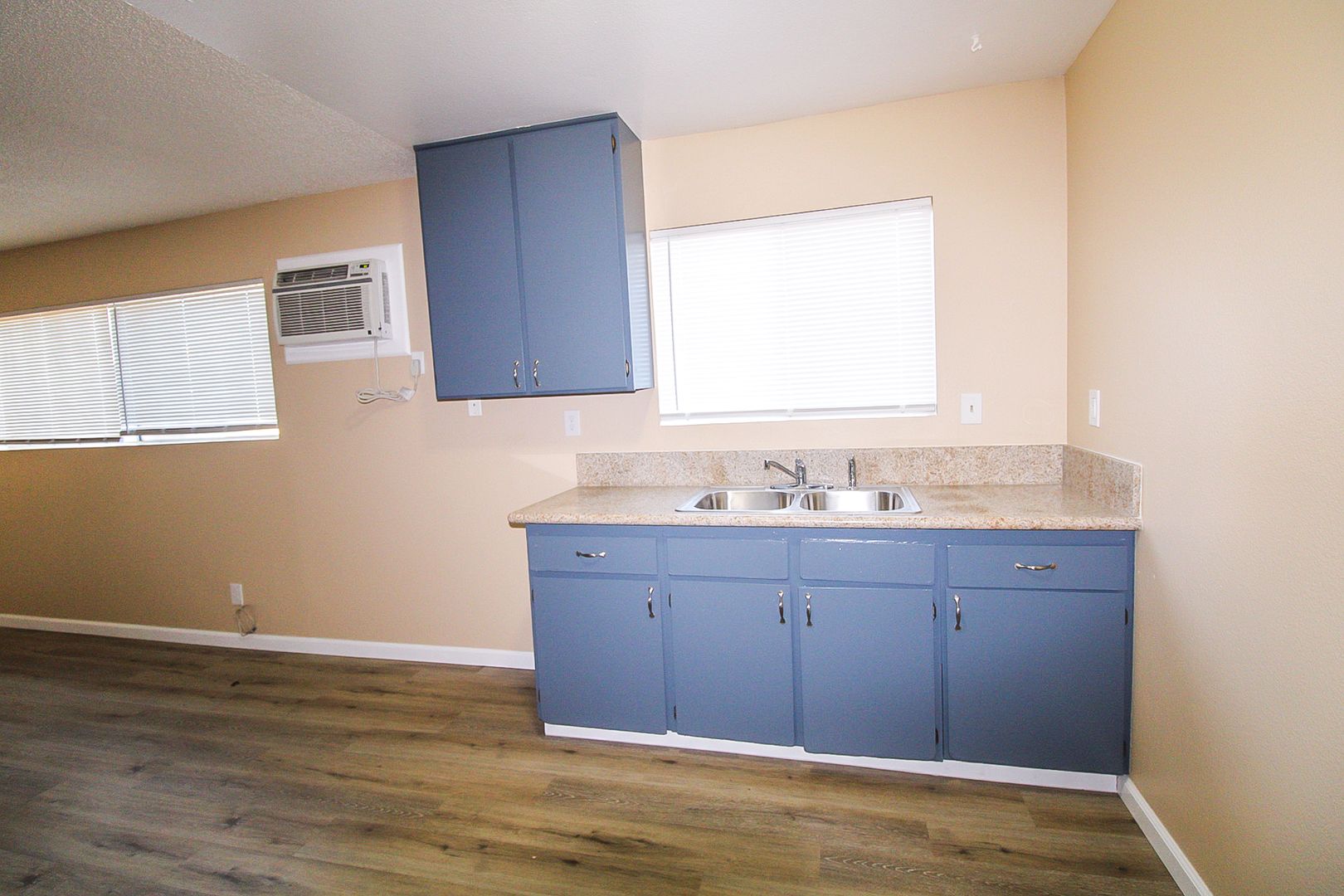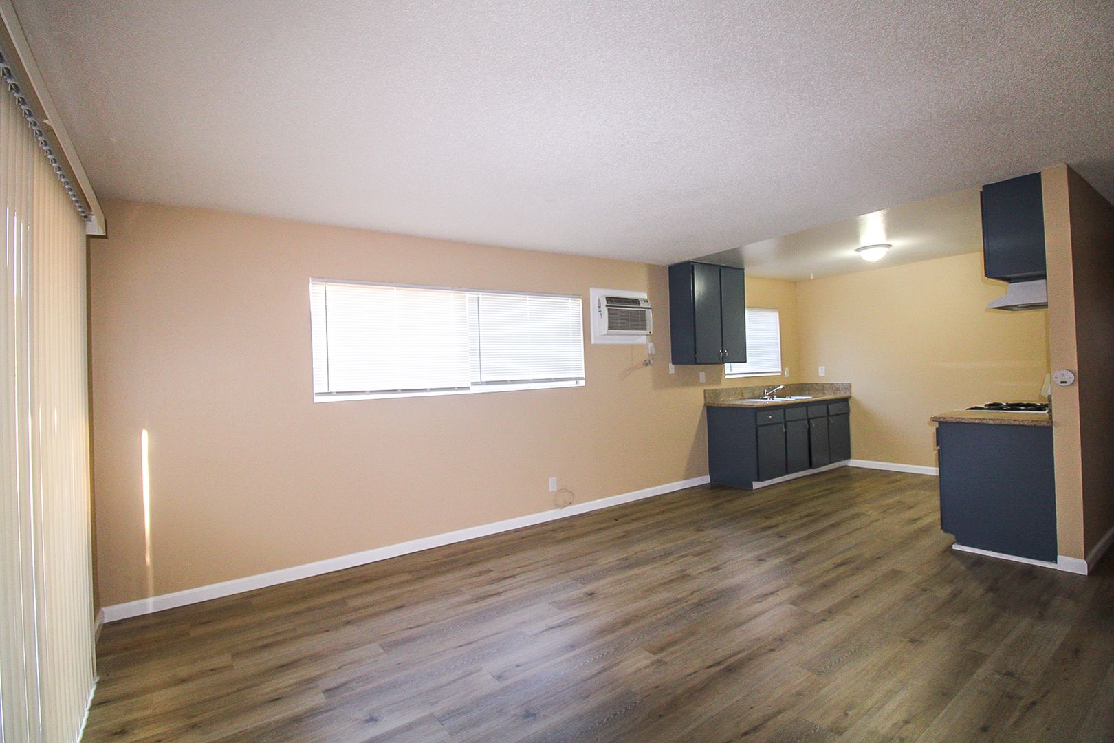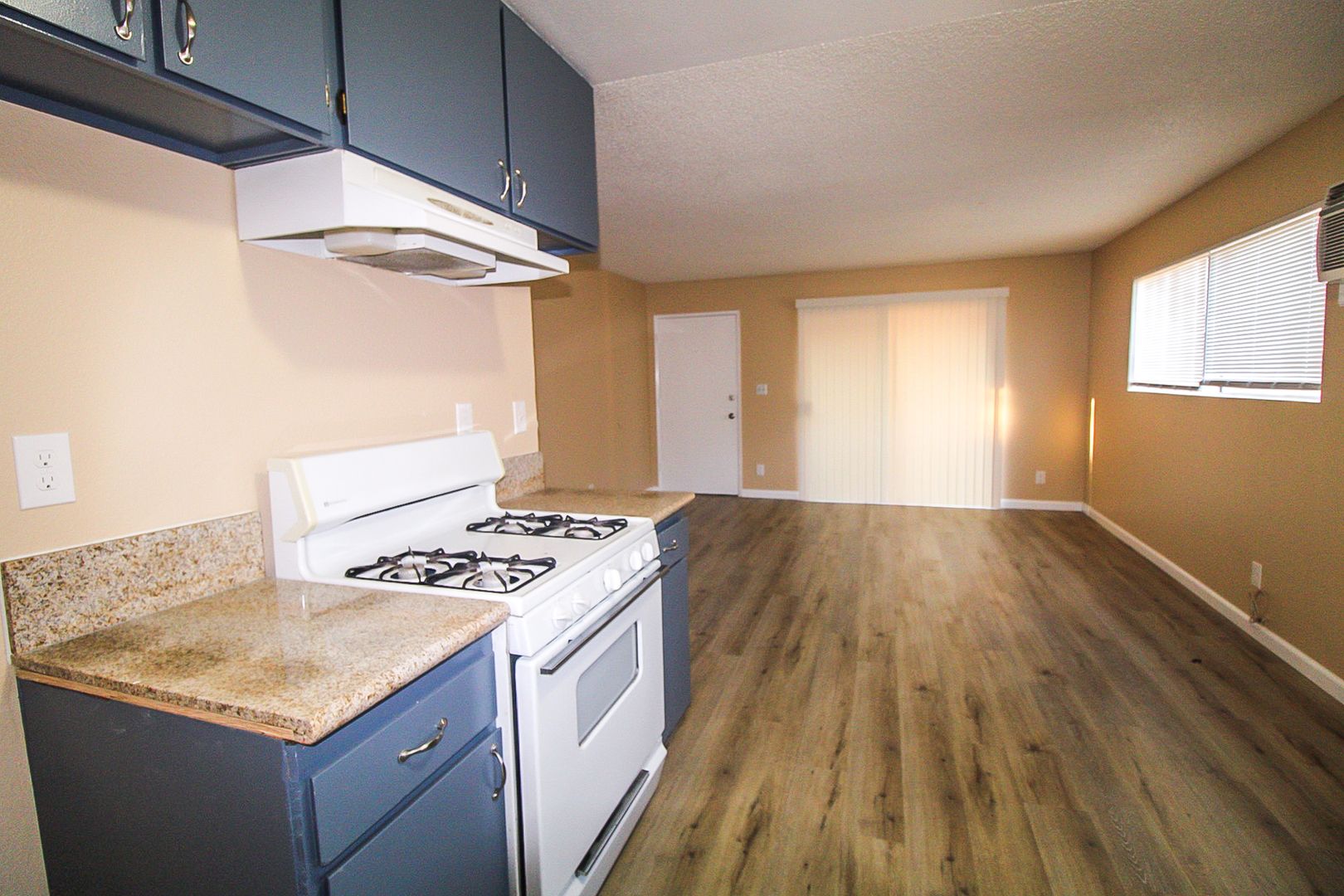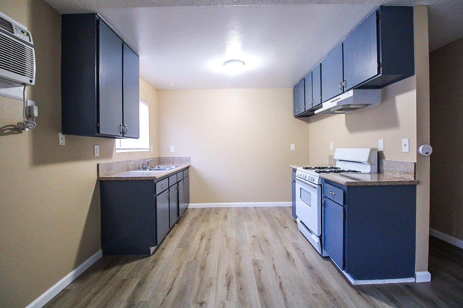 The kitchen includes granite countertops, a stove, a garbage disposal, and a mirrored closet. Stay comfortable year-round with a wall heater and wall A/C.