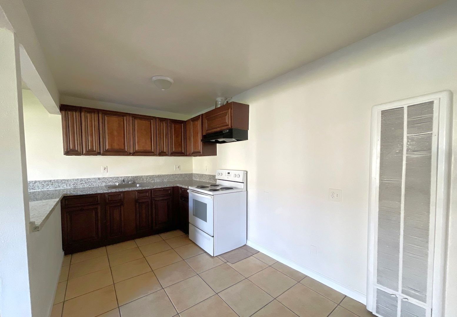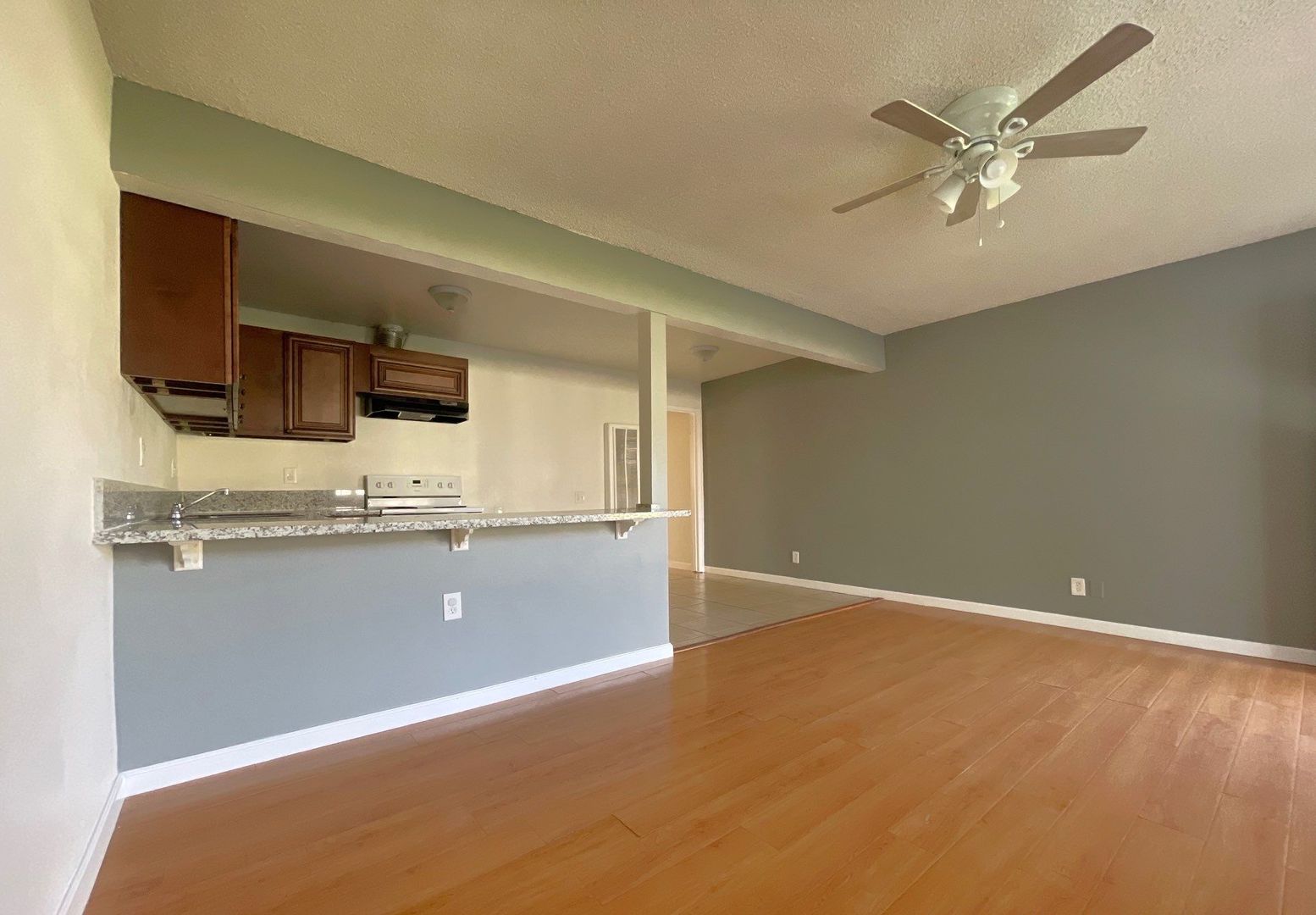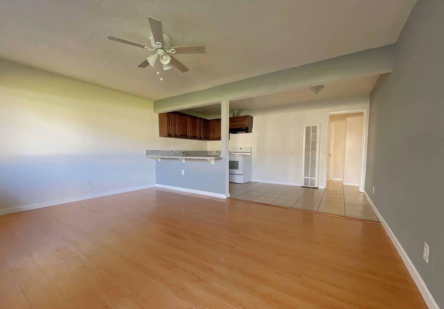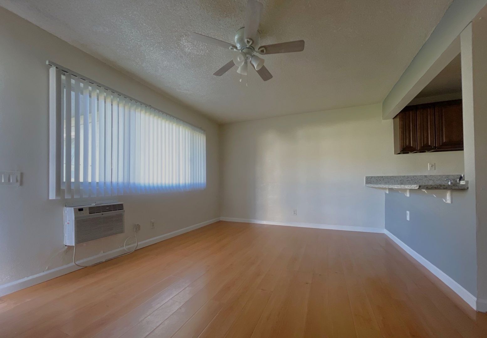 Enjoy a mix of tile and laminate wood flooring throughout the unit, along with added comforts like ceiling fans, a wall-mounted A/C unit, and a wall heater.