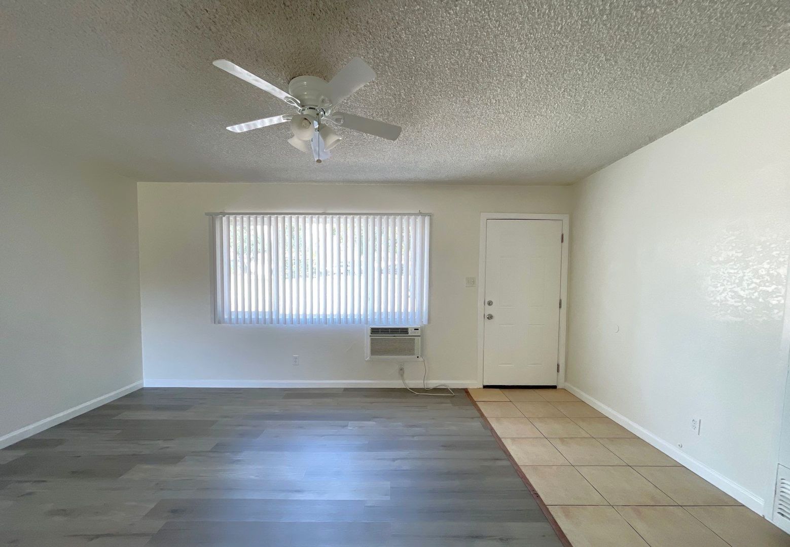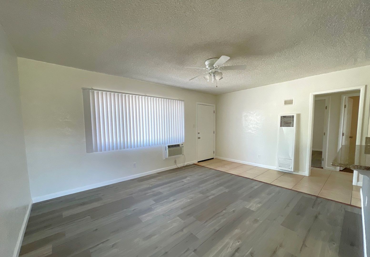 Enjoy a mix of tile and laminate wood flooring throughout the unit, along with added comforts like ceiling fans, a wall-mounted A/C unit, and a wall heater.