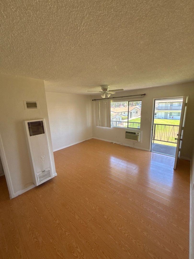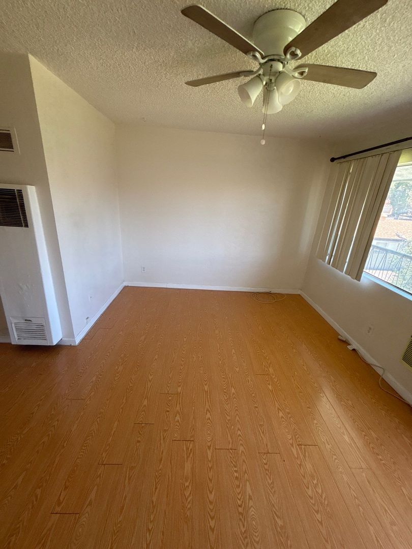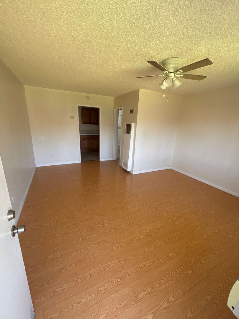 Charming 2nd-floor studio apartment located in a secure, gated community. This unit features laminate wood flooring, a wall AC and Wall heater, kitchen cabinets with granite countertops, a stove, a garbage disposal, and extra closets, with modern finishes throughout. Includes one assigned carport parking space and a ceiling fan.